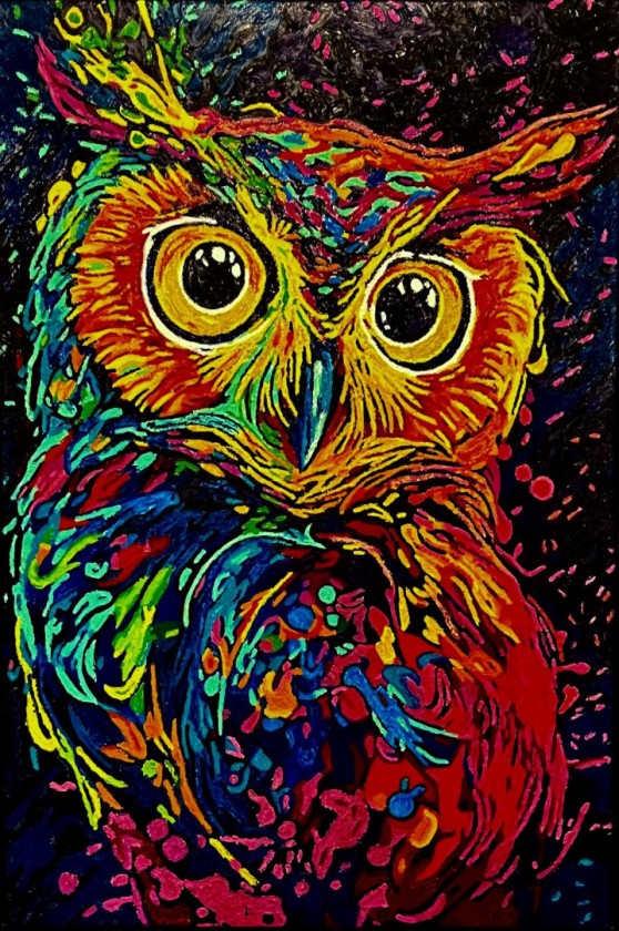 Melted, blended, layered and textured wax crayon on 20"x30" canvas for all your home and office decor. Unique and different. Neon Feathers - bursts with electric colour and unstoppable energy. This radiant owl, painted in swirling neon strokes, feels alive with curiosity and imagination. Its wide, glowing eyes invite viewers to see the world with wonder, courage, and playful creativity. A celebration of bold colour, wild expression, and youthful spirit.